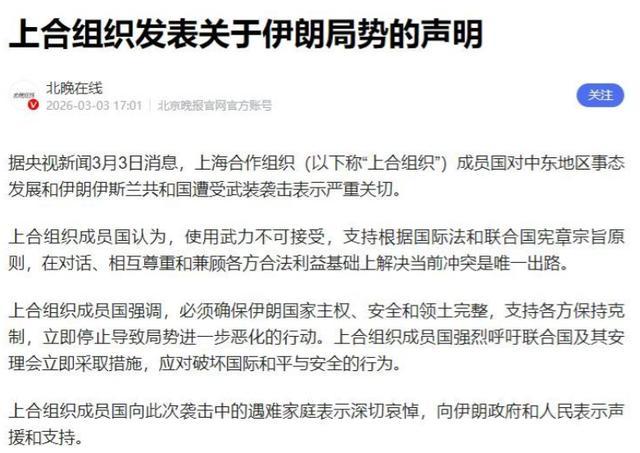 更绝的是,就在这通电话之后,不到24小时,上合组织就火速出手,联合发布了一份声明,反对用武力解决争端,坚决维护伊朗的主权和领土完整,主张在联合国框架下坐下来谈。
