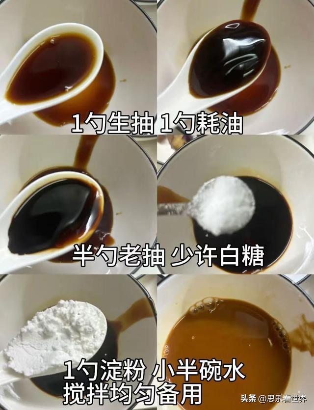 1. 茼蒿切段,根叶分开;调碗汁:1 勺生抽、蚝油,半勺老抽、少许糖,1 勺淀粉加半碗水搅匀。